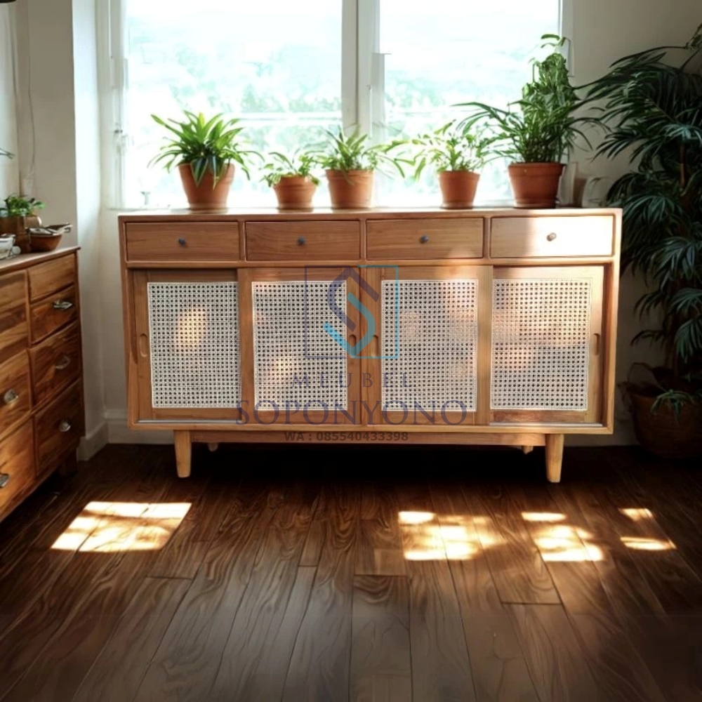 Keunggulan lain dari Meja Bufet TV Rotan Kayu Jati Minimalis adalah fleksibilitas penempatannya. Selain sebagai meja TV, furnitur ini juga dapat difungsikan sebagai bufet ruang makan, credenza atau bahkan sebagai meja konsol di lorong rumah. Desainnya yang timeless membuatnya tetap relevan dalam jangka panjang, terlepas dari tren interior yang terus berubah.