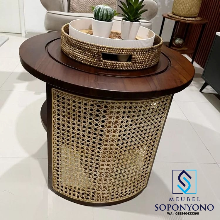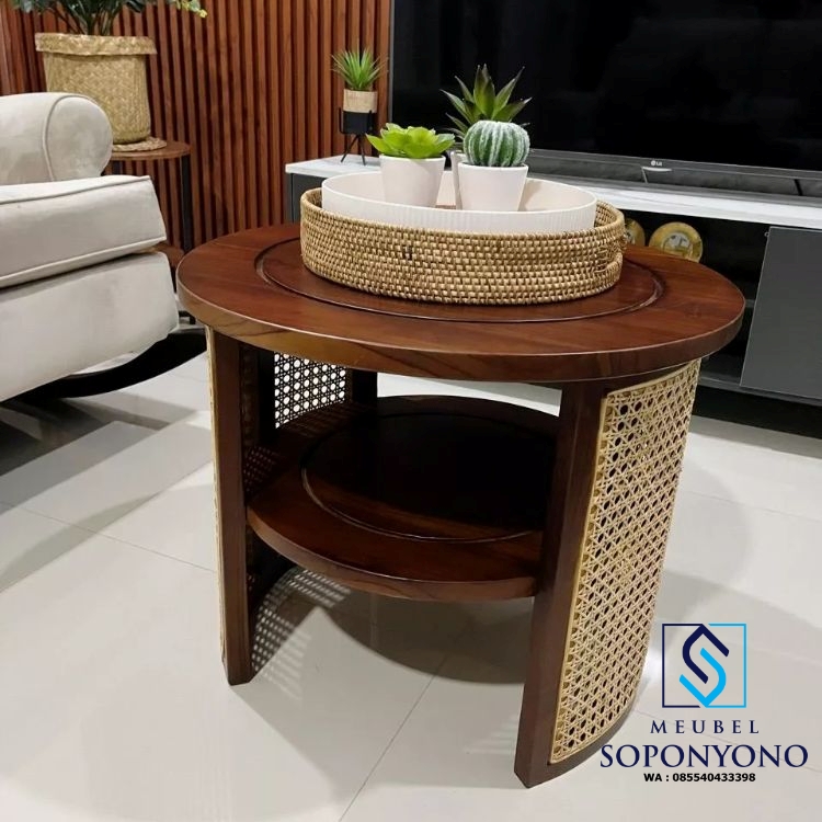 Meja Tamu Bulat Minimalis Jati Kombinasi Anyaman Rotan