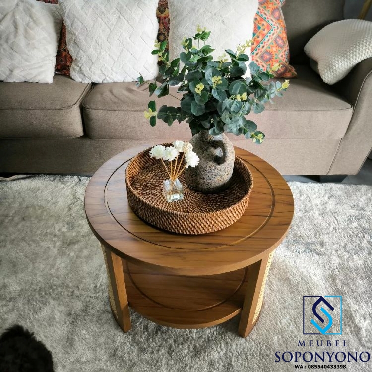 Selain keindahannya, Meja Tamu Bulat Minimalis Jati Kombinasi Anyaman Rotan juga unggul dalam aspek fungsionalitas. Struktur rangkanya kokoh dan stabil, menjadikannya ideal sebagai meja utama ruang tamu maupun meja dekoratif untuk menampilkan vas bunga, majalah atau aksesori rumah. Material jati yang tahan terhadap perubahan suhu dan kelembaban memastikan daya tahan jangka panjang, sementara rotan alami memberikan sirkulasi udara yang baik sehingga tetap awet dan tidak mudah lapuk.