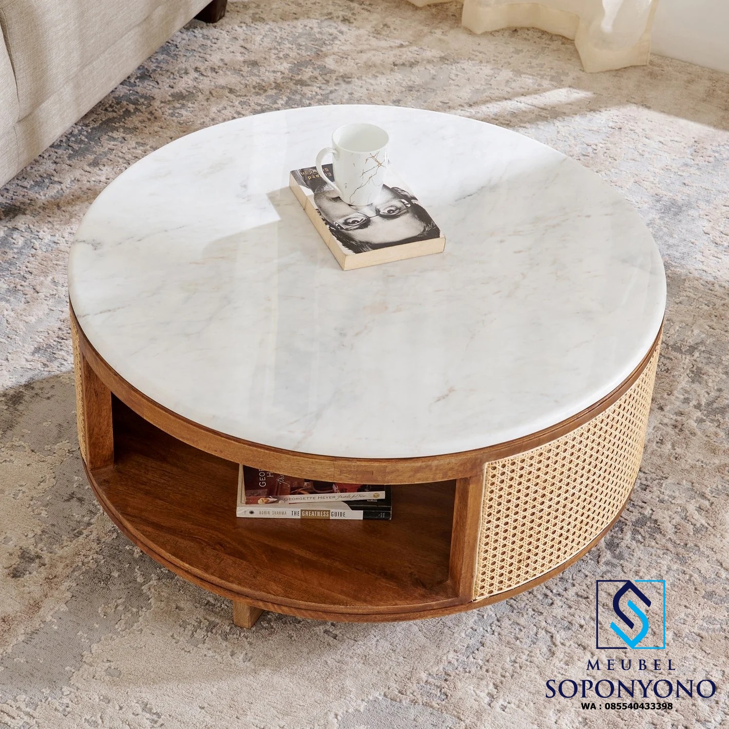 Meja Tamu Coffee Table Jati Solid Kombinasi Rotan dan Marmer merupakan karya furnitur yang memadukan kemewahan material alami dengan sentuhan desain modern bernuansa hangat dan elegan. Produk ini dirancang untuk menghadirkan kesan mewah namun tetap alami di ruang tamu, dengan kombinasi unik antara kayu jati solid yang kokoh, rotan alami yang bertekstur lembut, serta permukaan marmer yang berkilau dan eksklusif. Perpaduan ketiganya menciptakan harmoni visual yang menonjolkan karakter alami sekaligus memperkuat nilai estetika interior rumah.