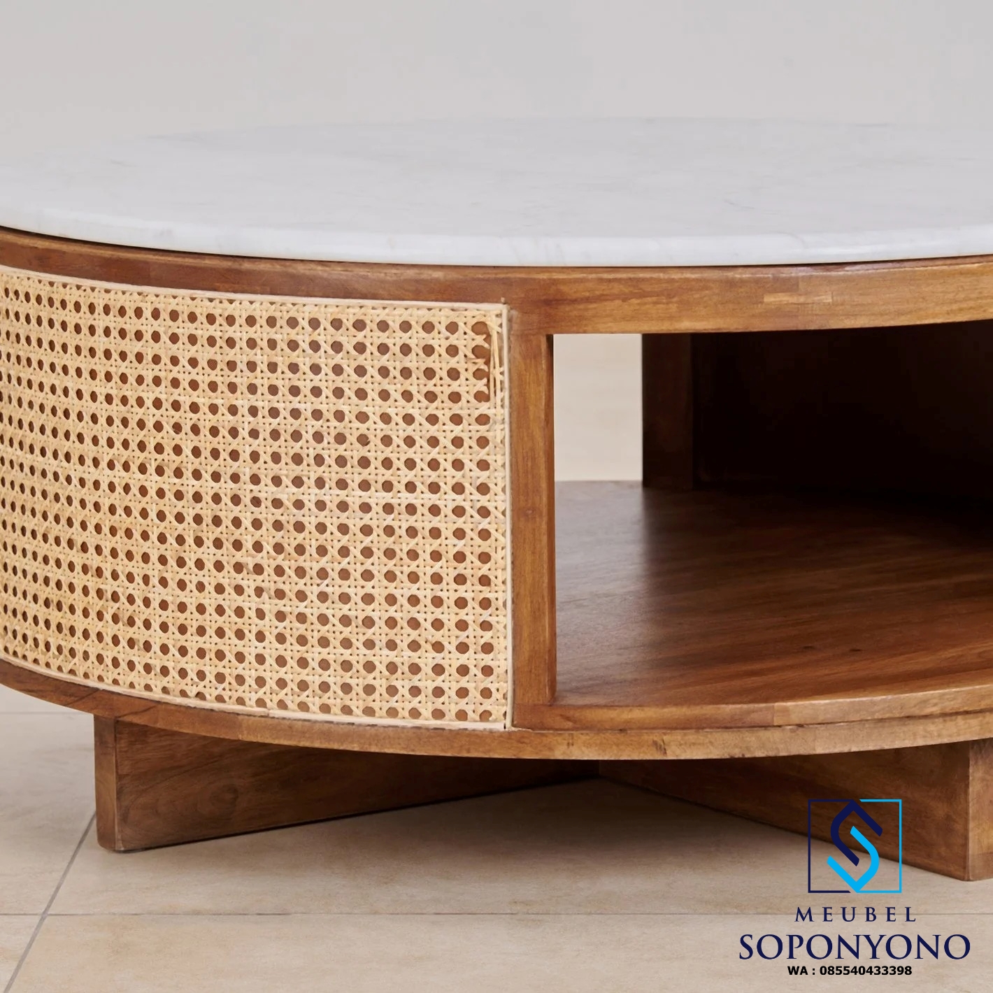 Meja Tamu Coffe Table Jati Solid Kombinasi Rotan dan Marmer
